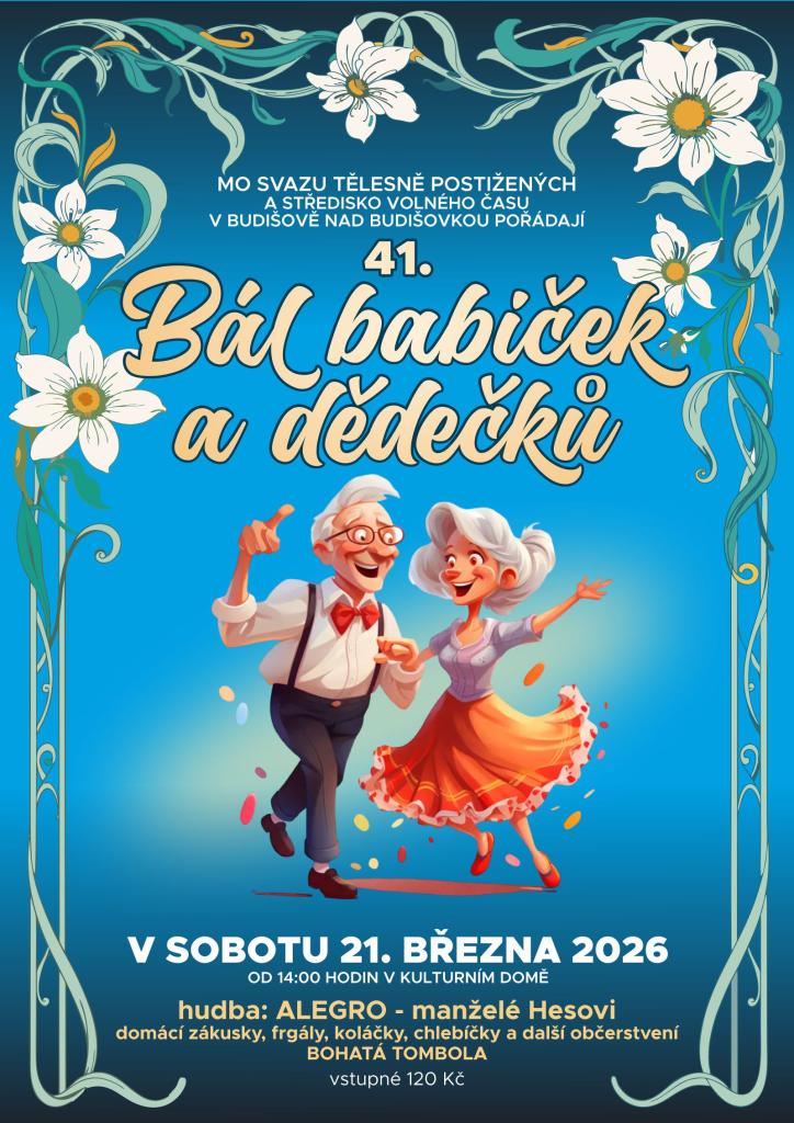 Zveme vás na BÁL BABIČEK A DĚDEČKŮ, který pořádá MO SVAZU TĚLESNĚ POSTIŽENÝCH a STŘEDISKO VOLNÉHO ČASU. Akce se uskuteční v sobotu 21. března 2026 od 14:00 hodin v kulturním domě v Budišově nad Budišovkou. K poslechu zahraje kapela Alegro - manželé Hesovi. Těšit se můžete na domácí zákusky, frgály, koláčky a chlebíčky. Součástí akce bude bohatá tombola, která nabídne zajímavé ceny. Vstupné je stanovené na 120 Kč, což přispěje na podporu činnosti našeho svazu.