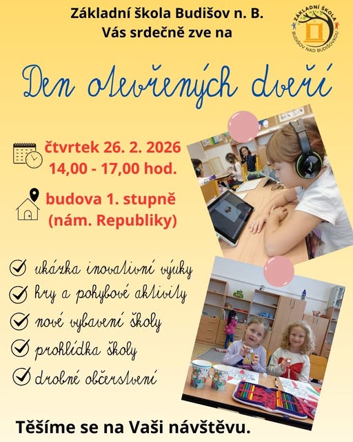Základní škola Budišov nad Budišovkou vás srdečně zve na Den otevřených dveří. Tento den budete mít možnost nahlédnout do výuky a prohlédnout si školní prostory. Akce se koná ve čtvrtek 26. února 2026 od 14:00 do 17:00 hodin v budově 1. stupně, která se nachází na náměstí Republiky. Nezmeškejte příležitost se seznámit s inovativními metodami výuky a prohlédnout si školu.